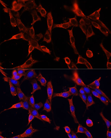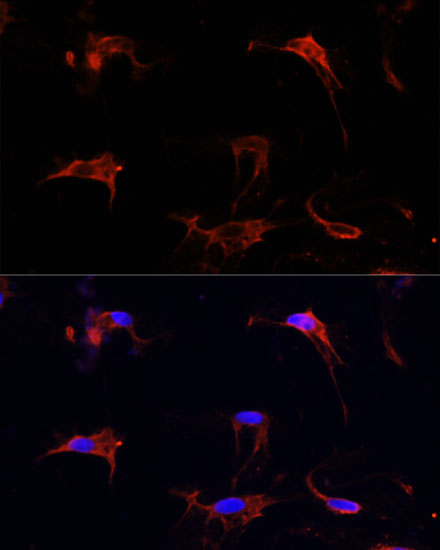 Immunofluorescence analysis of C6 cells using FBN1 Polyclonal Antibody.
