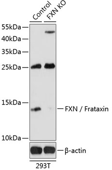 Western blot analysis of extracts from normal (control) and FXN / Frataxin knockout (KO) 293T cells, using FXN / Frataxin antibody. |