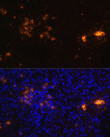 Immunofluorescence analysis of rat spleen using CD70 antibody. |
