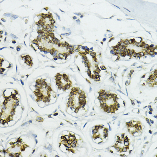 Immunohistochemistry of paraffin-embedded human breast using Lamin B1 antibody.