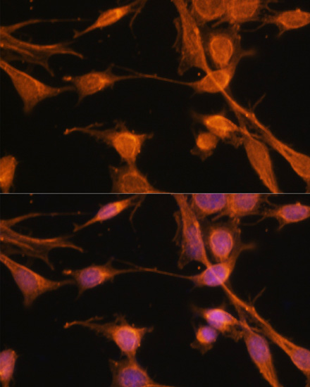 Immunofluorescence analysis of NIH-3T3 cells using SMAD2 antibody.