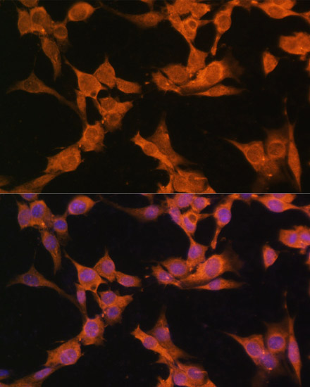 Immunofluorescence analysis of NIH/3T3 cells using CAMK2A antibody. |