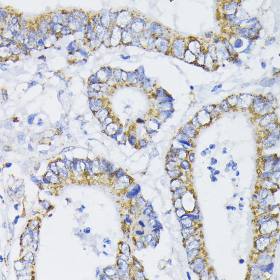 Immunohistochemistry of paraffin-embedded human colon carcinoma using PDHA1 antibody.
