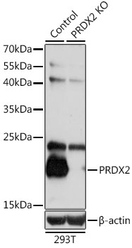 Western blot analysis of extracts from normal (control) and PRDX2 knockout (KO) 293T cells, using PRDX2 antibody.