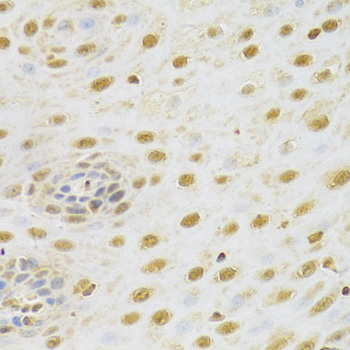 Immunohistochemistry of paraffin-embedded human esophageal cancer using RUNX1 Antibody.