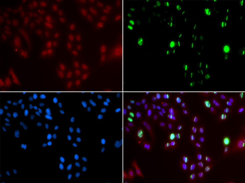 Immunofluorescence analysis of GFP-RNF168 transgenic U2OS cells using FANCD2 antibody. |