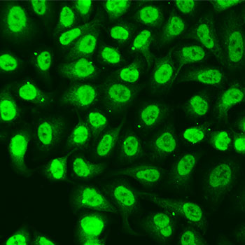Immunofluorescence analysis of U2OS cells using KU70 antibody. |