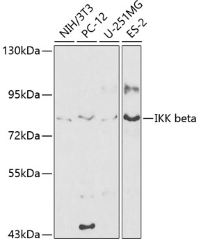 Western blot analysis of extracts of various cell lines, using IKK beta antibody.