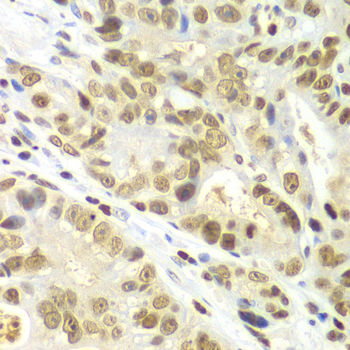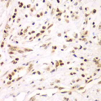 Immunohistochemistry of paraffin-embedded human gastric cancer using IKK beta antibody. |