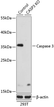 Western blot analysis of extracts from normal (control) and Caspase 3 knockout (KO) 293T cells, using Caspase 3 antibody.