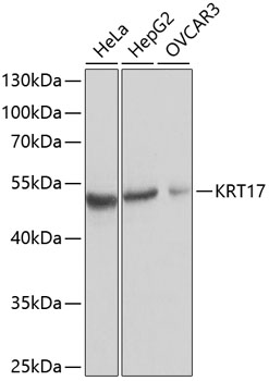 Western blot analysis of extracts of various cell lines, using KRT17 antibody.