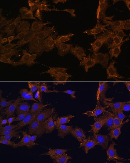 Immunofluorescence analysis of NIH/3T3 cells using PDGFR beta antibody. |