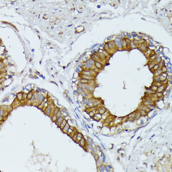 Immunohistochemistry of paraffin-embedded human mammary cancer using WNT1 antibody.