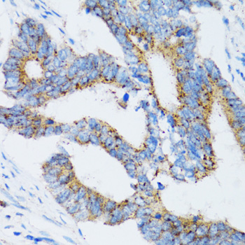 Immunohistochemistry of paraffin-embedded human colon carcinoma using SIAH1 antibody. |