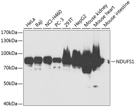 Western blot analysis of extracts of various cell lines, using NDUFS1 antibody. |
