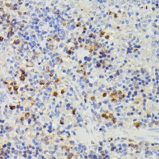 Immunohistochemistry of paraffin-embedded rat spleen using DUT antibody.
