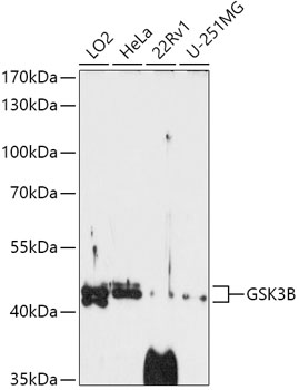 Western blot analysis of extracts of various cell lines, using GSK3B antibody. |
