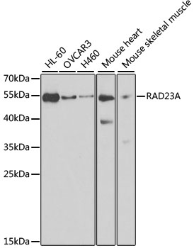 Western blot analysis of extracts of various cell lines, using RAD23A antibody. |