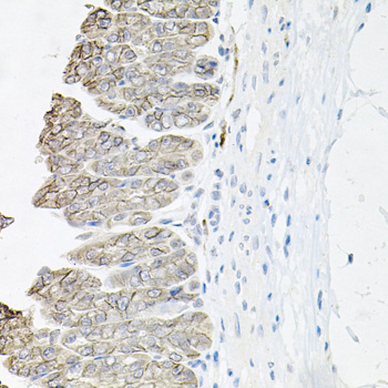 Immunohistochemistry of paraffin-embedded mouse stomach using ATP1B1 antibody.