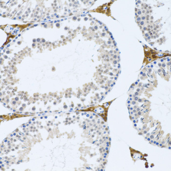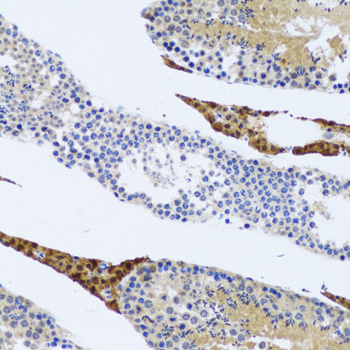 Immunohistochemistry of paraffin-embedded mouse testis using FMOD antibody. |