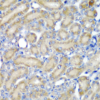 Immunohistochemistry of paraffin-embedded rat kidney using PDCD6 antibody.