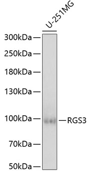 Western blot analysis of extracts of U-251MG cells, using RGS3 antibody. |
