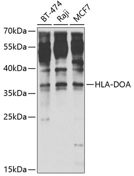 Western blot analysis of extracts of various cell lines, using HLA-DOA antibody. |