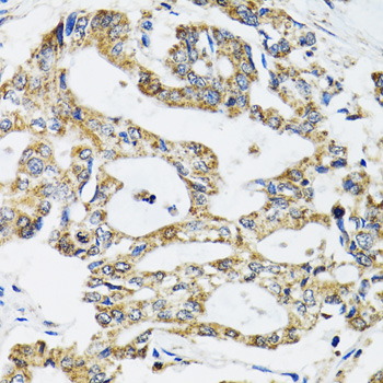 Immunohistochemistry of paraffin-embedded human colon carcinoma using SSBP1 antibody.