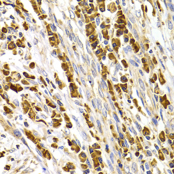 Immunohistochemistry of paraffin-embedded human stomach cancer using TACR3 antibody. |