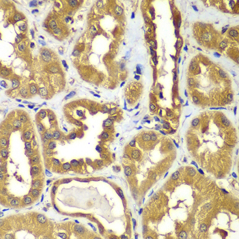 Immunohistochemistry of paraffin-embedded human kidney using RAB1B antibody. |