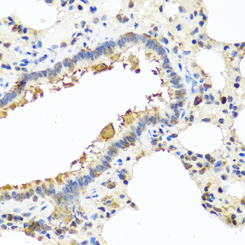 Immunohistochemistry of paraffin-embedded rat lung using CHI3L2 antibody.