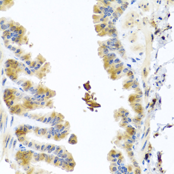 Immunohistochemistry of paraffin-embedded mouse lung using CHI3L2 antibody. |