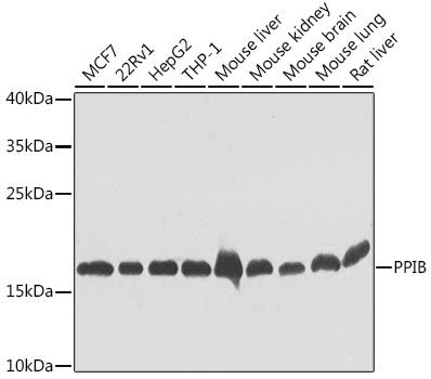 Western blot analysis of extracts of various cell lines, using PPIB antibody. |