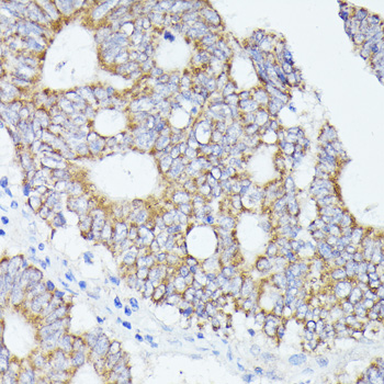 Immunohistochemistry of paraffin-embedded human colon carcinoma using ACAT2 antibody.