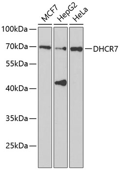 Western blot analysis of extracts of various cell lines, using DHCR7 antibody. |