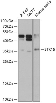 Western blot analysis of extracts of various cell lines, using STK16 antibody. |