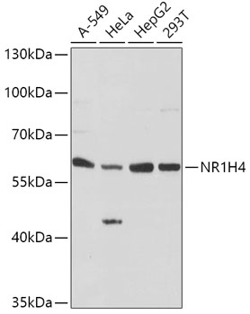 Western blot analysis of extracts of various cell lines, using NR1H4 antibody. |