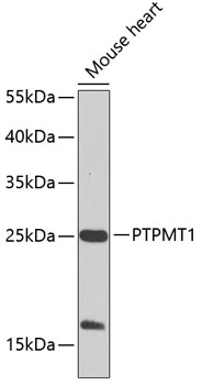 Western blot analysis of extracts of mouse heart, using PTPMT1 Antibody. |