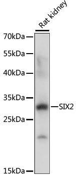 Western blot analysis of extracts of Rat kidney, using SIX2 antibody. |