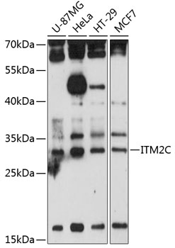Western blot analysis of extracts of various cell lines, using ITM2C antibody. |