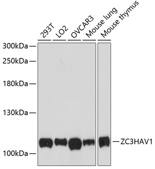 Western blot analysis of extracts of various cell lines, using ZC3HAV1 antibody. |