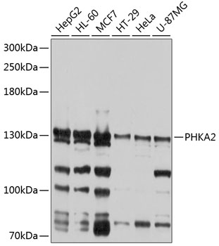 Western blot analysis of extracts of various cell lines, using PHKA2 antibody. |