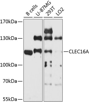 Western blot analysis of extracts of various cell lines, using CLEC16A antibody. |