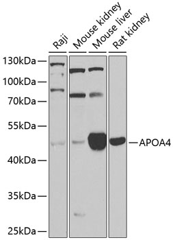 Western blot analysis of extracts of various cell lines, using APOA4 antibody. |