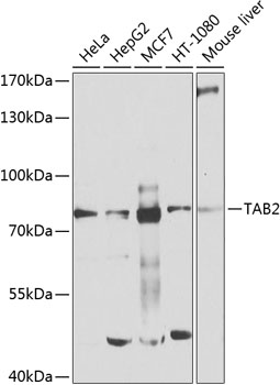 Western blot analysis of extracts of various cell lines, using TAB2 antibody. |