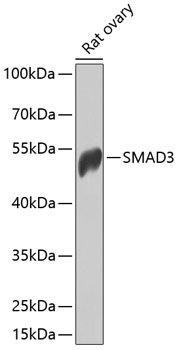 Western blot analysis of extracts of rat ovary, using SMAD3 antibody. |