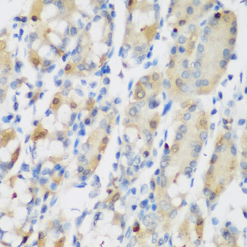 Immunohistochemistry of paraffin-embedded human stomach using RRM1 antibody. |