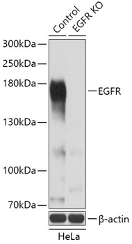 Western blot analysis of extracts from normal (control) and EGFR knockout (KO) HeLa cells, using EGFR antibody.