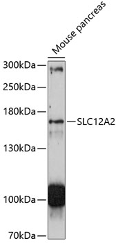 Western blot analysis of extracts of mouse pancreas, using SLC12A2 antibody.