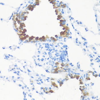 Immunohistochemistry of paraffin-embedded mouse lung using FGF10 antibody.